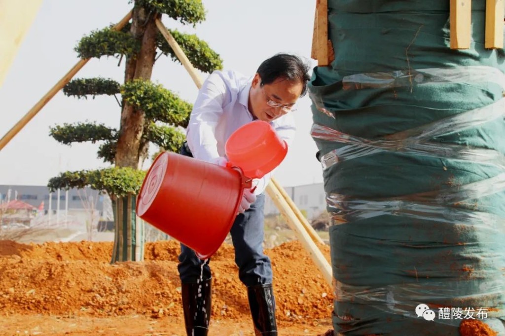 9点20分,王利波、刘新华、阳建、贺小玲、廖胜云等来到东富工业园植树点,投身义务添绿队伍行列。参加活动的全体市领导分工协作、相互配合,大家挥锨铲土、培实新土、提桶浇水,先后种下红枫、红叶石楠、杜英、紫薇等树种,为园区添上抹抹新绿。一个上午时间,900多棵新栽种的树苗错落有致、昂首挺立,它们在春风里、在阳光下焕发勃勃生机。