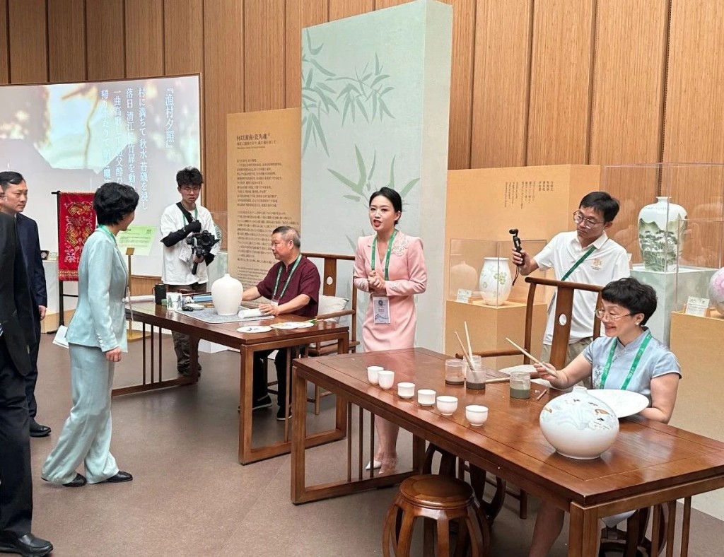 在非遗展区,醴陵釉下五彩瓷成为焦点。不仅有《万紫千红》等六件醴瓷精品现场展出,非遗传人陈利还现场演示了“勾线分水”技法,将水与色的微妙平衡转化为灵动的艺术语言。来自日本及世界各地的观众纷纷驻足围观,并踊跃尝试体验这一神奇技艺。