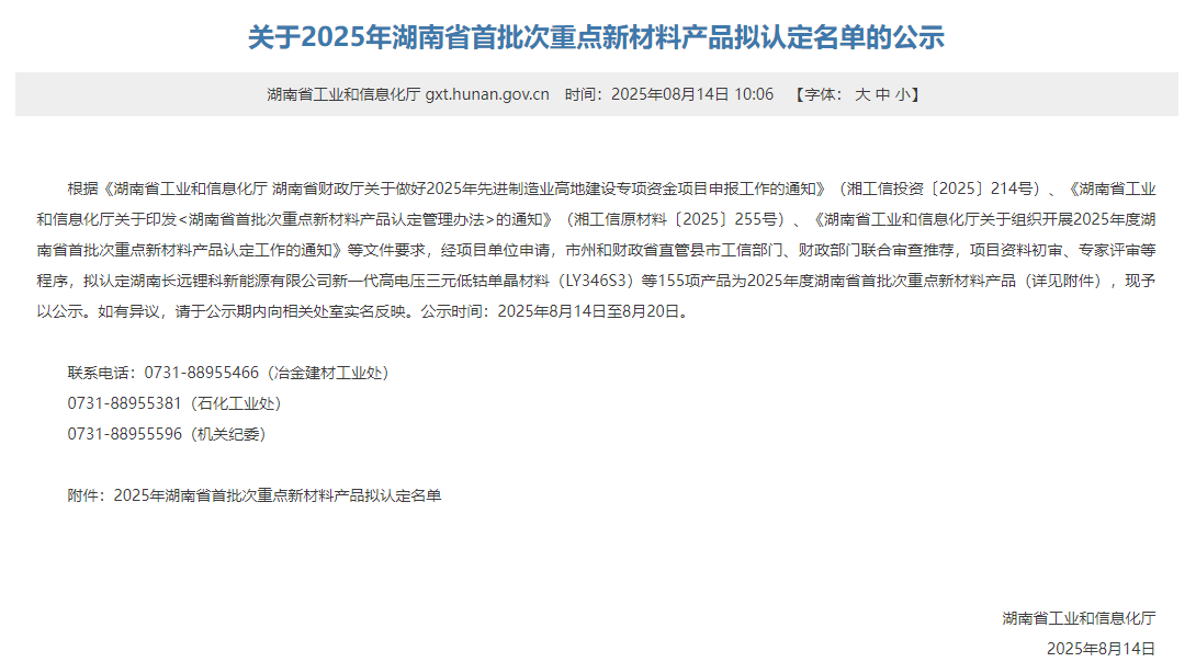 近日,湖南省工业和信息化厅公布了2025年湖南省首批次重点新材料产品拟认定名单,其中,我市共有5项产品入选。
