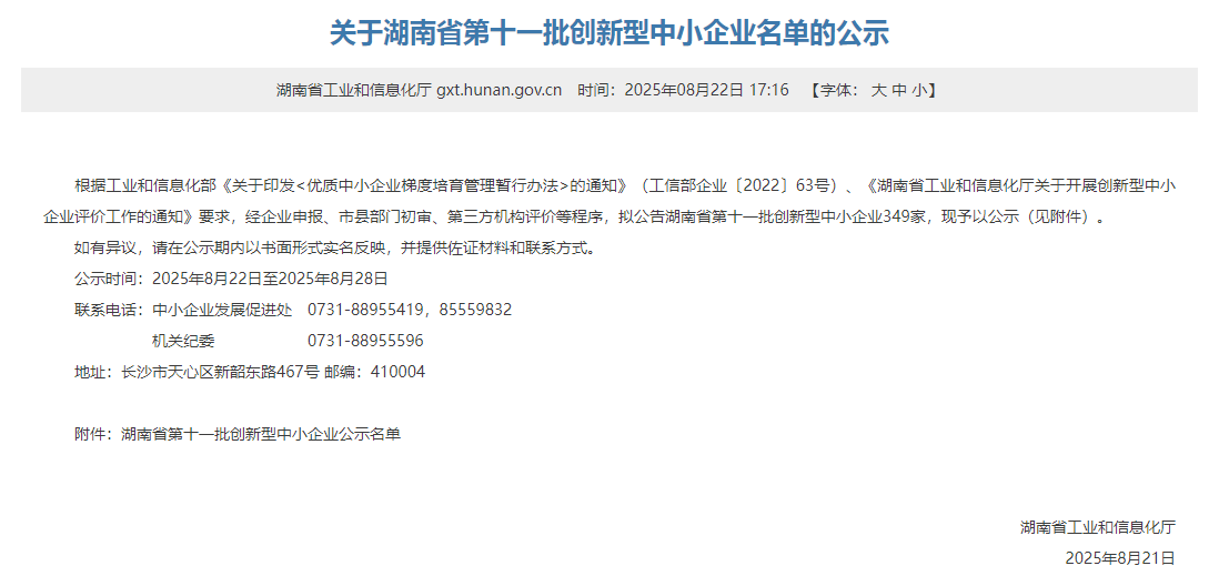 8月28日,湖南省工业和信息化厅发布的《关于湖南省第十一批创新型中小企业名单的公示》公示期结束,经企业申报、市县部门初审、第三方机构评价等程序,醴陵9家企业入选。