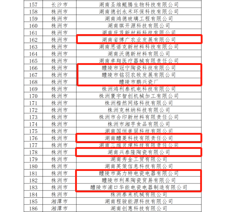 醴陵此批入选的9家企业涵盖了日用陶瓷、电瓷、农业生产、铜材产品生产等多个领域,分别为醴陵市鹏兴瓷厂、醴陵市利果陶瓷贸易有限公司、醴陵市铭羽农牧发展有限公司、醴陵市浦口华能电瓷电器制造有限公司、湖南省博广农业发展有限公司、醴陵市冠宁陶瓷科技有限公司、湖南醴菱科技有限责任公司、湖南兴泰隆陶瓷有限公司、醴陵市高力特电瓷电器有限公司。