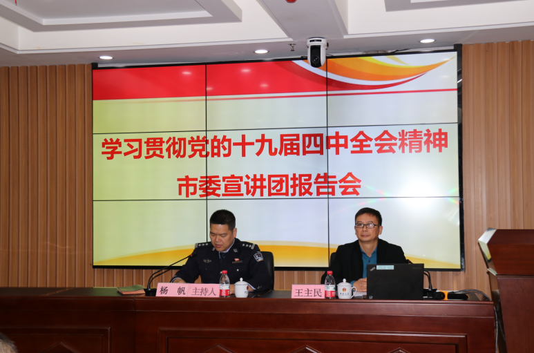 为深入学习宣传贯彻党的十九届四中全会精神,引导广大党员民警把思想和行动统一到全会精神上来,2019年12月18日下午,市局举行党的十九届四中全会精神集中宣讲会。市委宣讲团成员、市委党校副校长王主民应邀授课。市人民政府副市长、市局局长何忠明出席会议,市人民政府副调研员、市局政委杨帆主持会议,市局在家局领导、中层正职以及机关民警代表参加会议。