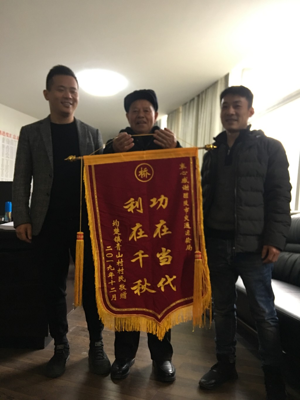 12月30日,醴陵市原贫困村均楚镇青山村83岁退休教师钟安然向醴陵市交通运输局送来锦旗,对该局10月份在青山村组织修建的便民桥“太阳桥”表达谢意。