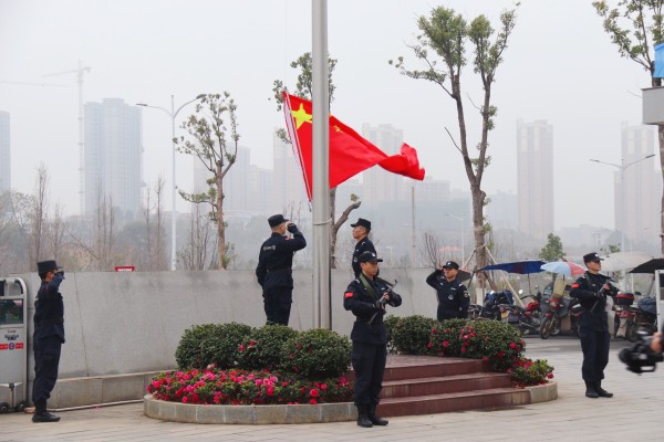 上午8时许,伴随指挥员的口令,六名护旗手昂首挺胸、精神抖擞,护着鲜艳的五星红旗,迈着矫健整齐的步伐走向升旗台。在雄壮的国歌声中,五星红旗冉冉升起、迎风飘扬,全体民警心潮澎湃,向国旗行举手礼。