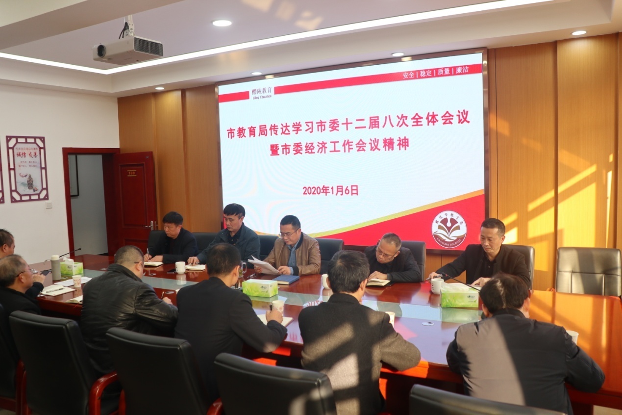 1月6日下午,市教育局召开专题会议,传达市委十二届八次全体(扩大)会议暨市委经济工作会议精神,安排部署2020年工作。市教育局在家领导班子及局务会全体成员参加会议。