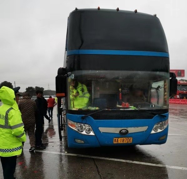 1月10日下午,春运第一天,一辆从宁波开往云南昭通,乘载近70人的大巴车,因涉嫌非法营运,被春运沪昆高速执勤点执法人员在沪昆高速醴陵服务区查获后,移至醴陵市交通运输局。