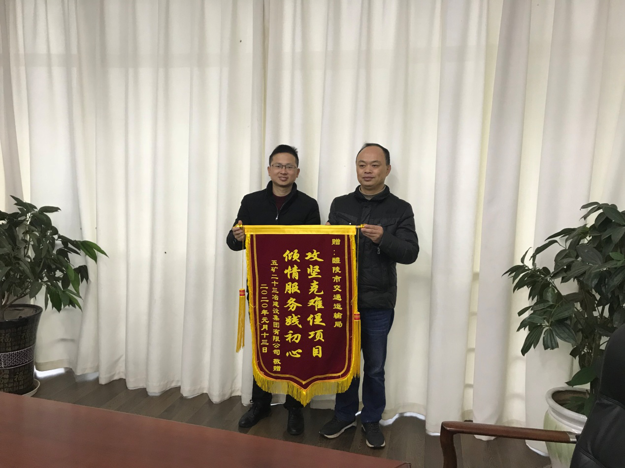 2020年1月15日,城市外环线A段SPV公司总经理钟建武带领公司主要领导和员工为市交通运输局送来“攻坚克难促项目,倾情服务践初心”的锦旗,以表示对市交通运输局作为该项目实施机构三年多的贴心服务与大力支持。