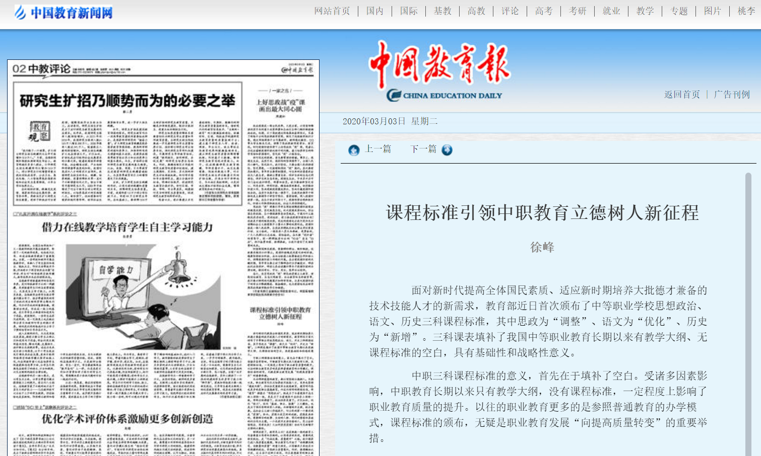 醴陵市陶瓷烟花职业技术学校党委书记、校长徐峰在 《中国教育报》发表署名文章: 课程标准引领中职教育立德树人新征程