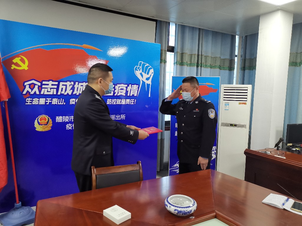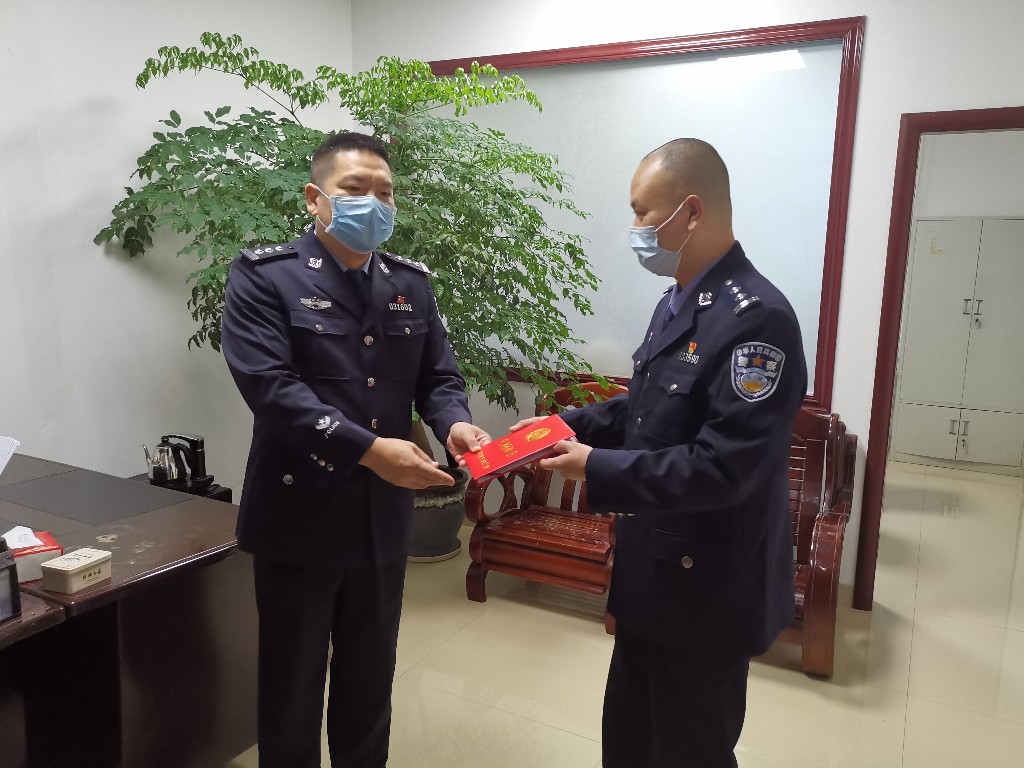 为贯彻落实战时政治建警工作要求,增强民警的仪式感、荣誉感,2020年3月4日下午,市人民政府副调研员、市局政委杨帆开展战时表彰送奖上门活动,为荣获株洲市公安局个人嘉奖的姚战国同志以及荣记个人三等功的唐开孝同志颁发荣誉证书。