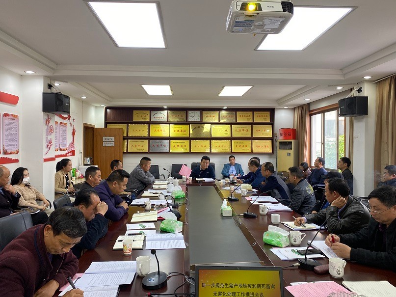 为有效控制非洲猪瘟疫情跨区域传播风险,严厉打击违法违规调运生猪行为,促进生猪生产加快恢复,醴陵市认真贯彻落实上级部署,4月24日下午,市畜牧水产事务中心召开了进一步规范生猪产地检疫工作推进会议,以规范生猪产地检疫行为为抓手,全面开展违法违规调运生猪行为专项整治行动,杜绝不检疫就出证、倒卖检疫证章标志等违法行为,确保本地生猪调运秩序正常,有效阻断疫情传播风险。中心领导班子、动监所全体人员、相关业务股室负责人及全市动物防疫站站长共40余人参加会议。