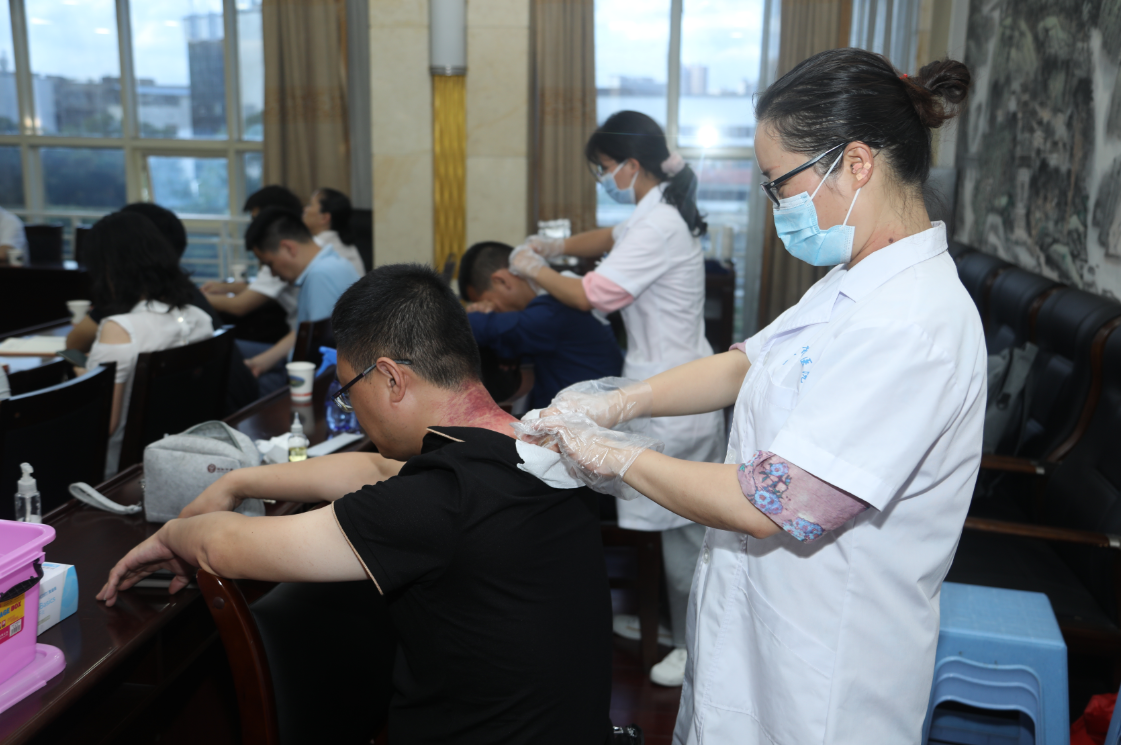 同时,市中医院中医团队还现场为大家一一进行刮痧理疗,给大家带来了独特的体验,让大家对中医有了更深的了解。最后,中医团队还带领大家一起做甩手操,整场中医养生专题讲座在愉悦活泼的气氛中结束。