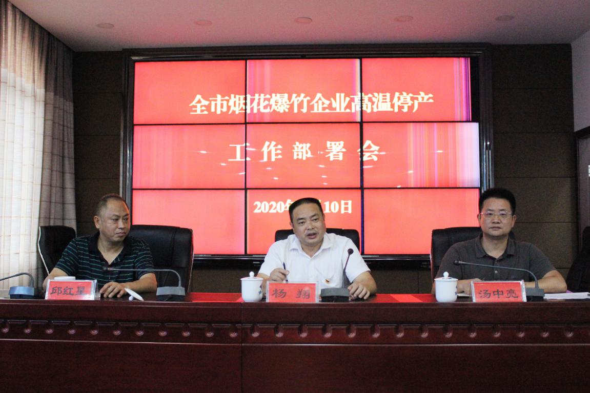 杨翔强调,一要思想认识到位。当前已进入高温酷暑季节,高温、雷电、暴雨等极端天气频繁,极易引发烟花爆竹安全事故,加上近期国内外事故频发,安全形势异常严峻。各镇街要高度重视高温季节烟花爆竹安全生产工作,牢固树立红线、底线和高压线意识,以高度的责任感和使命感,把工作落细落实。二要工作举措到位。要加强对限温生产企业的"一对一"监管、"点对点"服务。高温停产期间,各镇、街要督促烟花爆竹企业将工房剩余药物、半成品清理入库,妥善保存或处置,对生产线、装药机电闸等张贴封条,确保封停到位;要采取夜间巡查、重点抽查等方式加大日常监管,对擅自恢复生产的企业,一经发现,立即依法依规严肃查处;要组织开展安全生产集中整治和隐患排查,严查"三超一改"行为,坚决杜绝超标违禁产品,抓好工库房提质改造及生产设施设备维护保养;要督促企业严格落实领导带班值守制度,加强对重点部位的安全巡查;要保持打非治违高压态势,对非法组织烟花爆竹生产的,坚决打击取缔。三要责任落实到位。要利用高温停产契机,借鉴周边省、市模式,深入推进"一证多厂"专项整治行动,严厉打击多股东分线、转包分包生产等违法违规行为。要按照省、市部署要求,指导"一证多厂"企业切实做好资产、生产经营、安全管理"三统一"工作。凡是涉及到"一证多厂"企业整改不到位的一律不予复工复产,坚决打赢"一证多厂"等顽瘴痼疾攻坚战。