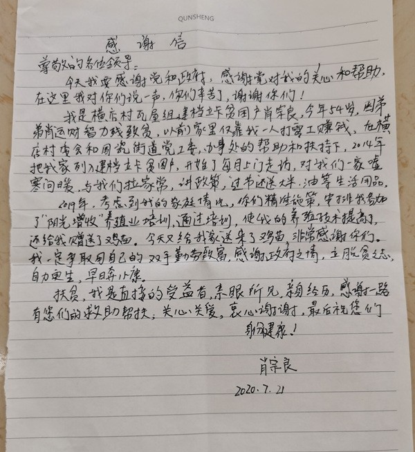写信的人叫肖宗良,今年54岁,50岁的弟弟智力三级残疾,一直由他照顾。2014年被识别纳入为贫困户后,在党和政府关怀下,一家人的生活发生了翻天覆地的变化。镇村干部及帮扶责任人当起了扶贫政策的解说员、协调工作的联络员、致富门路的设计员,日常的嘘寒问暖,节日的关心慰问,生产生活上帮扶,享受了产业扶贫、医疗救助、低保、小额信贷、残疾人两项补贴等政策,于2016年脱贫。同时,肖宗良一家在脱贫的路上不等不靠,2019年通过打工和发展种养殖产业,全家人均纯收入达到7767元,日子一天比一天红火。