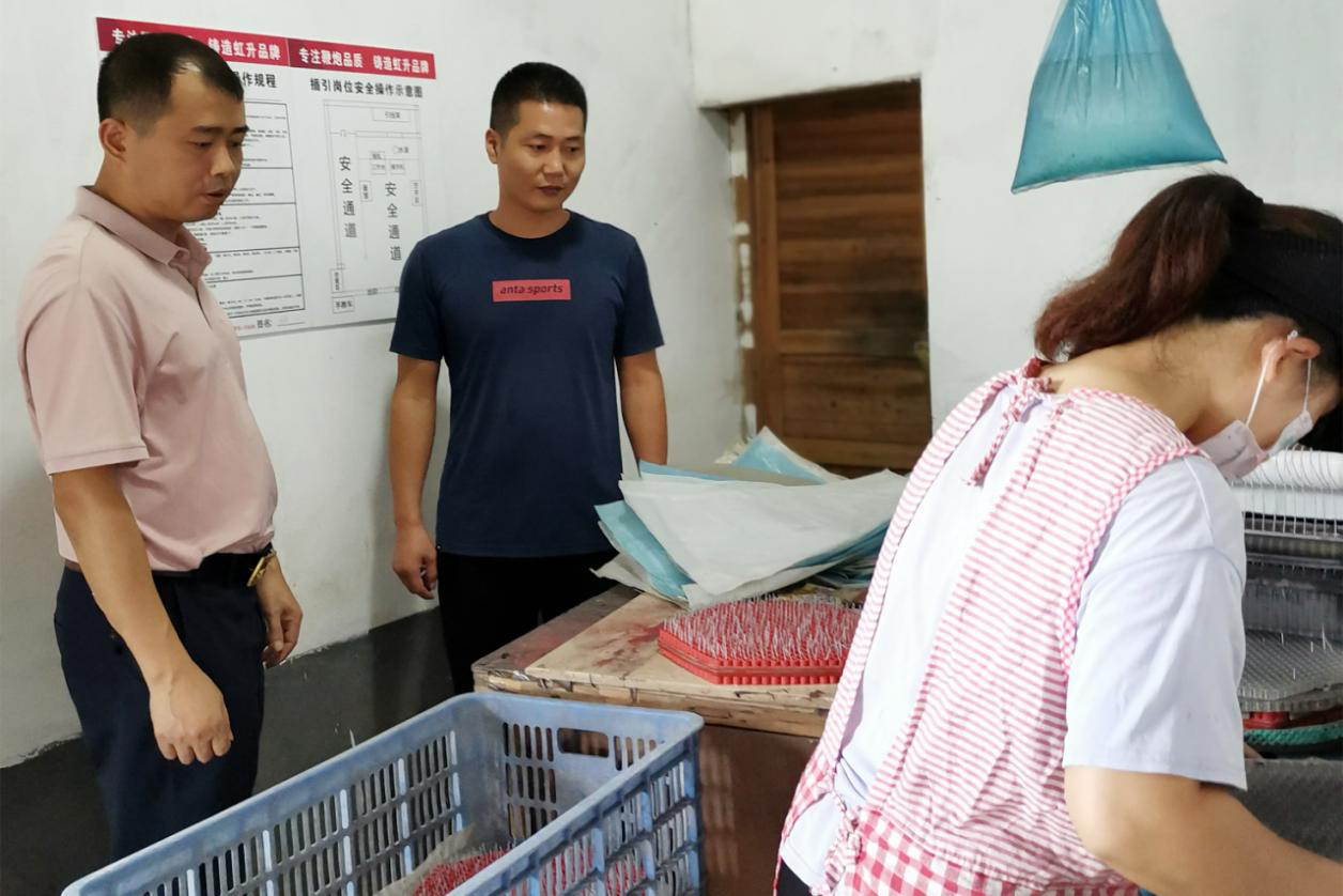 随后,相关工作人员又来到虹日烟花鞭炮厂,该厂插引车间已经启动生产。工作人员仔细检查该厂的安全设施、警示标语等设置情况,并询问操作工人安全注意事项,同时要求企业做好下一阶段的秋、冬两季防静电设施检查工作。