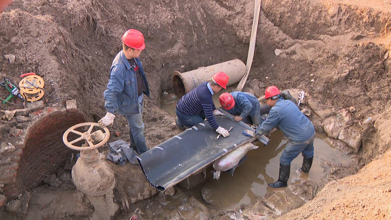12月23日,在三刀石沿岸一处施工现场,施工人员正在管道的接口部位施工,他们将高密度聚乙烯内衬管植入原管道内,形成与旧管道紧密配合的内衬层,对老旧管道进行功能性修复。