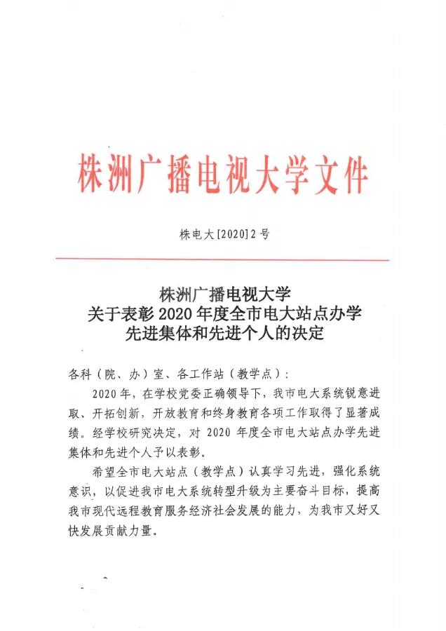 近日,从株洲广播电视大学获知,醴陵电大工作站荣获2020年全市电大"优秀站点"、"教学工作先进单位"、"资源配置建设工作先进单位"荣誉,钱德老师荣获"先进个人"称号。这是醴陵电大工作站继获株洲市电大2019年度"办学招生工作先进单位"后,连续第四年获全市电大先进集体称号。