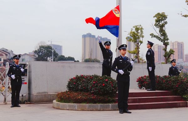 伴随着指挥员的口令,六名护旗手昂首挺胸、精神抖擞,护着中国人民警察警旗,踏着铿锵步伐,走向升旗台。在警歌声中,警旗冉冉升起、迎风飘扬,全体干警心潮澎湃,行举手礼,向警旗致敬。随后,全体干警面向警旗重温入警誓词。
