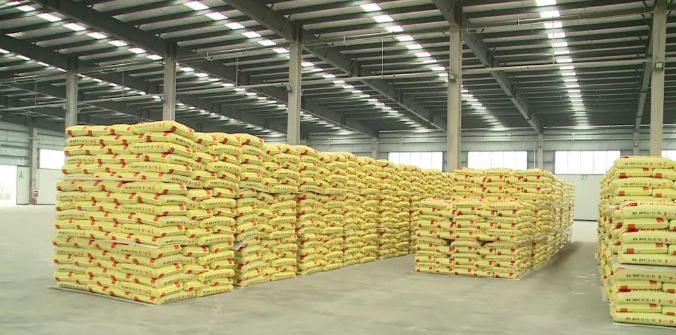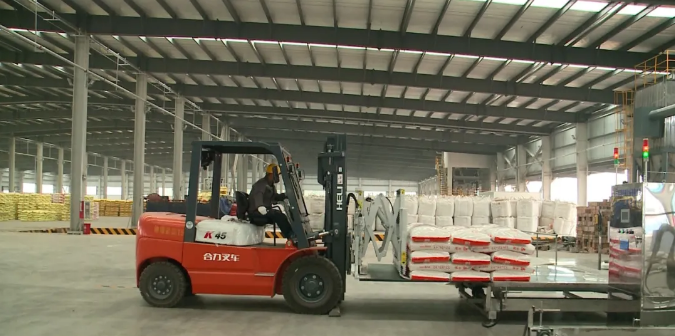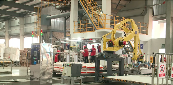 在中盐美福生态肥业有限公司一期仓库外,一辆辆大货车正排队等候装货。包装车间内,工人们忙着打包密封,机械臂则迅速抓取成品,整齐码放装车。而另一侧,正在紧急增设一条自动化包装生产线,以满足目前高效的生产状态。