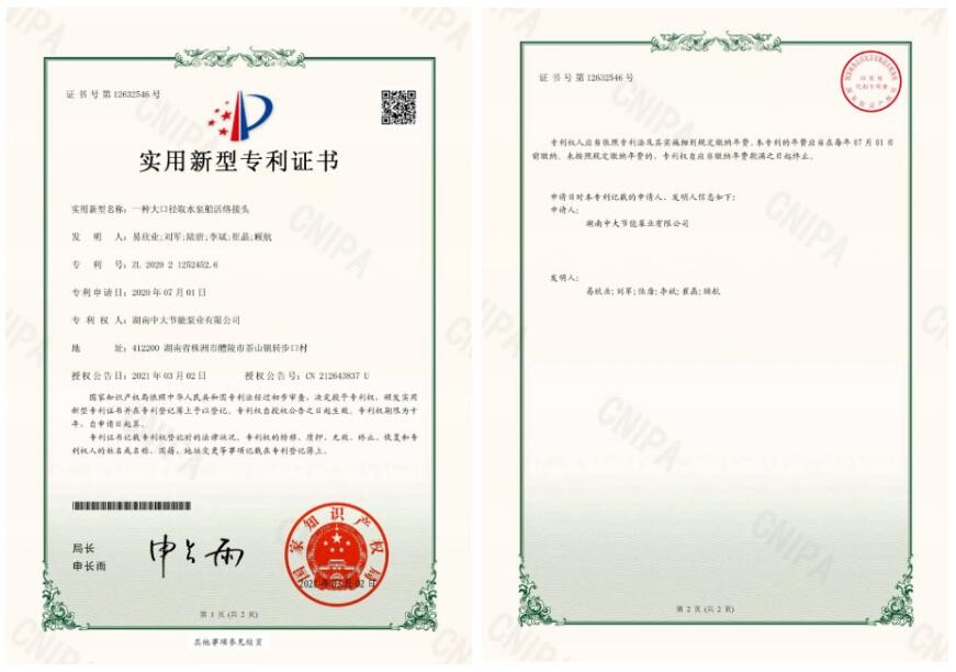 近日,湖南省陶瓷技师学院机电工程产业系与湖南中大节能泵业有限公司联合研发的实用新型专利通过了国家知识产权局认证,专利名称为《一种大口径取水泵船活络接头》,证书号:12632546号,授权公告号:CN 212643837 U。这是湖南省陶瓷技师学院积极响应国家政策,深化校企合作,践行产学研深度融合,促进科研成果转化为生产力、协助企业发展业务、服务地方经济发展的有力见证。