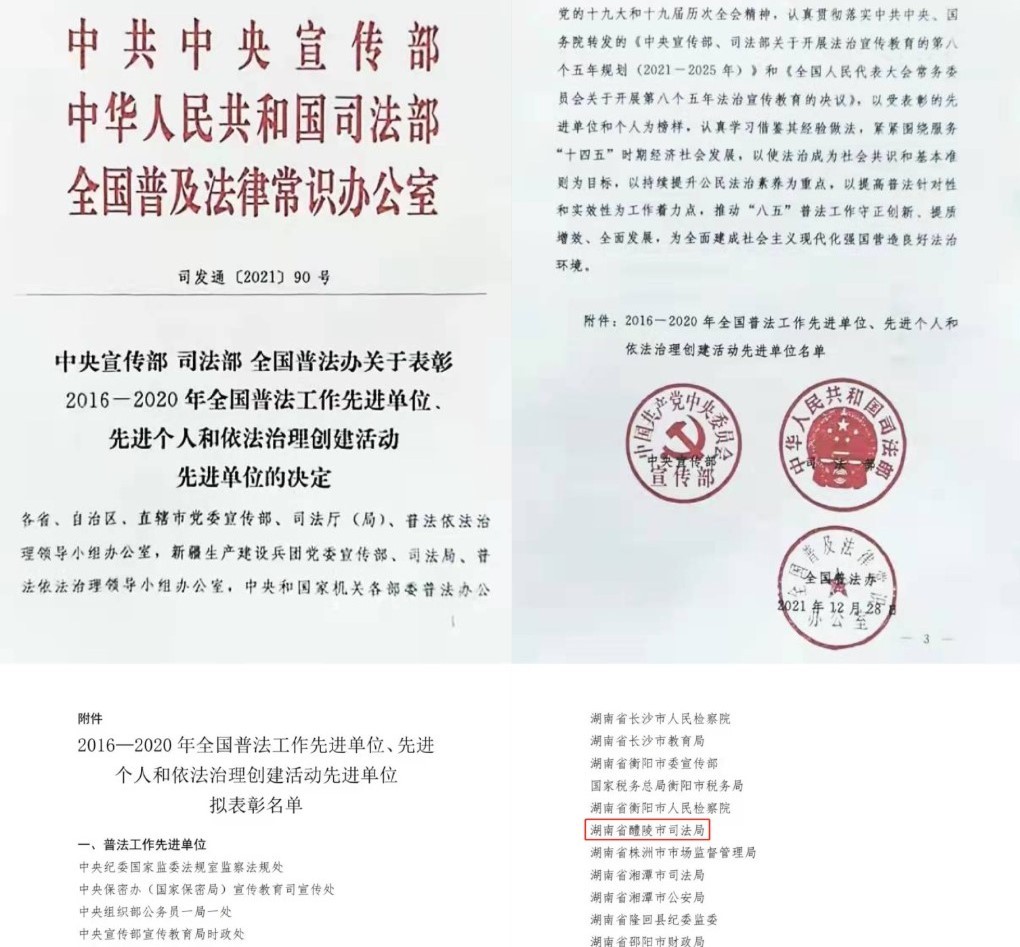 近日,中宣部、司法部、全国普法办联合发文,对2016—2020年全国普法工作表现突出的单位和个人进行表彰通报,醴陵市司法局获评2016—2020年全国普法工作先进单位,系株洲市司法行政系统唯一获此殊荣单位。