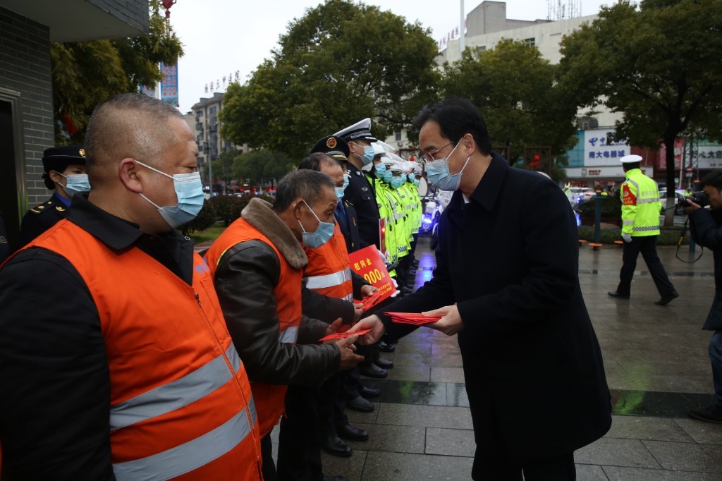 王利波、阳建随后来到执勤岗亭,看望一线交警和城管队员、环卫工人,向大家亲切问好。王利波说:醴陵交警无惧风雨坚守岗位,顶着寒暑挺身执勤,始终保持着极高的路面见警率,得到了政府信任,赢得了群众满意。环卫工人们干着看似不起眼的“小事”,却成就了城市看得到的大美。你们夜深人静时把脏活累活默默担下,为城市创建立下了汗马功劳。王利波还对城管队员说:群众过年,你们“过关”。新的一年,希望大家继续努力,做好值班值守,作出新的更大贡献。