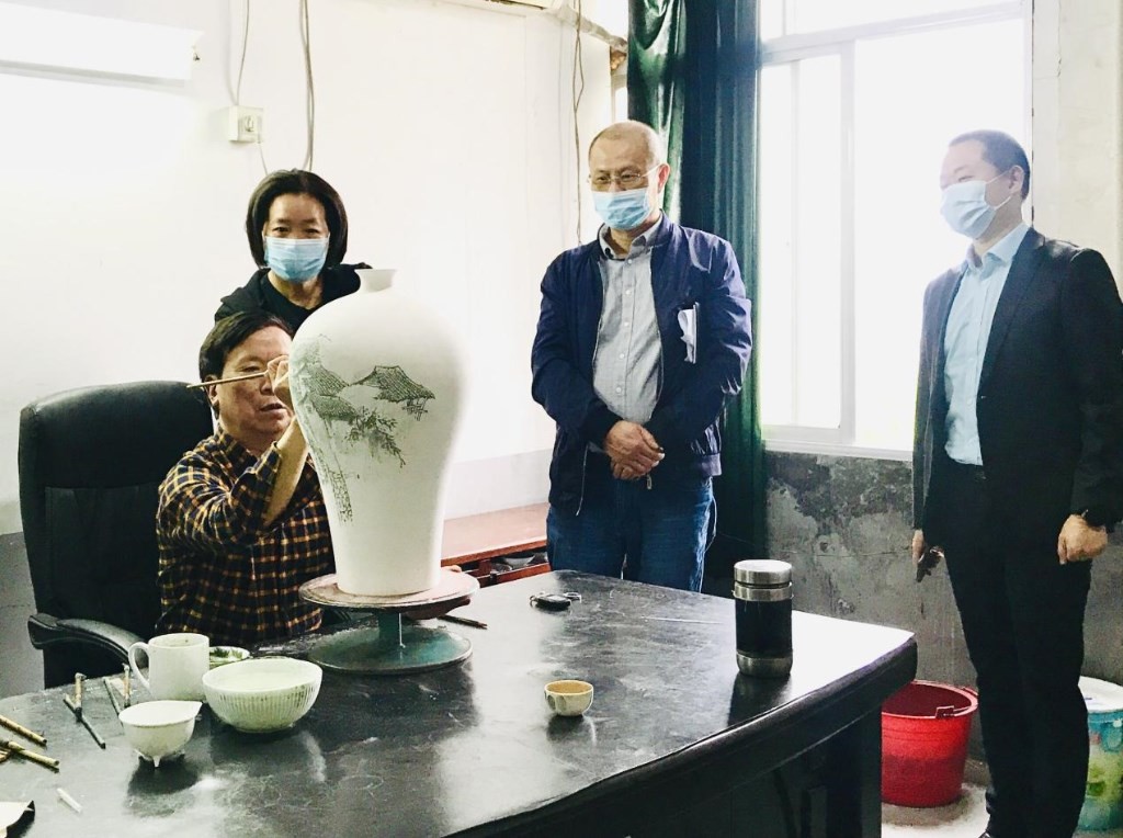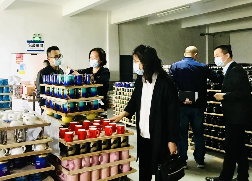 王庆玲一行首先来到红官窑展厅,了解企业经营范围和主打产品,随后又步入生产车间和大师工作室,详细询问企业的生产工序、用工情况,最后来到会议室,与企业代表进行座谈。