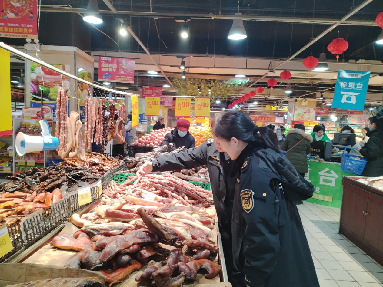 走进商超,执法人员主要针对节日期间消费较多、群众关注度较高的米面粮油、水果蔬菜、肉制品、腊制品、酒类等重点品种进行监督检查,深入开展专项整治,督促食品经营者严格落实进货查验制度,是否明码标价,广告宣传是否合法,有无经营过期变质、"三无"食品等行为。杜绝销售"三无"食品、超过保质期食品、来源不明食品,督促各经营者严格落实食品安全主体责任,把好原料进货关、生产经营条件关及食品索证索票关,杜绝不合格食品进入市场,从源头上保障食品安全。