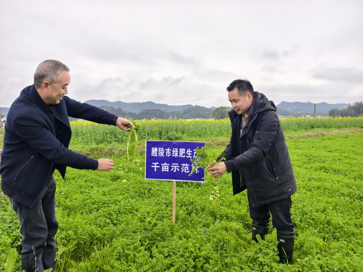 面对极端天气挑战,醴陵市依托科研力量强化防灾减灾。2024年冬,在降雨量较往年同期偏少四成的不利条件下,组织专家深入田间指导,提出“灌跑马水、冻后补损、病虫防治”三大技术措施。冻害田块适时追施尿素促恢复,渍水区及时清淤排涝,并针对性防治病虫害,确保绿肥健康生长。科学的管护技术为绿肥高产提供了坚实保障,克服不利气候影响,示范片亩产普遍达1200公斤,高产田突破1500公斤。
