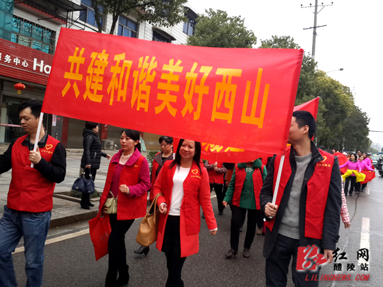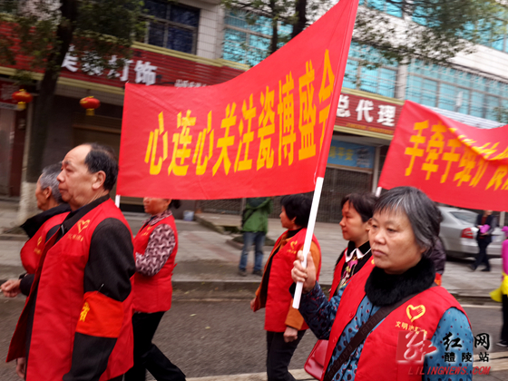 3月18日,西山街道办事处以“喜迎瓷博会,共创卫生城”为主题开展了一次大型宣传活动。上午8点,24名志愿者及60名老年活动中心腰鼓队、军鼓队、秧歌队组成16列方队,从桎木嘴广场出发,志愿者高举“创建国家卫生城市,共建和谐美好西山”,“瓷城是我家,瓷博靠大家”的条幅,机关工作人员向沿街店铺及路人发放《致居民的一封信》共3000余份,发动广大群众积极为“瓷博会”、“创卫”作贡献,以主人翁的姿态展现醴陵人民的风采。