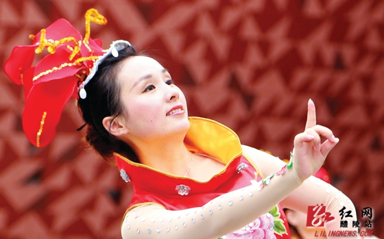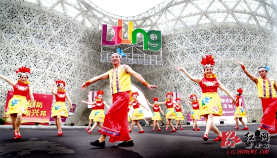 7月16日,在醴陵·世界陶瓷艺术城,五彩艺术团成员盛装出演,拍摄《思情鬼歌》排舞教学片。