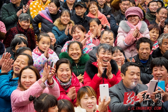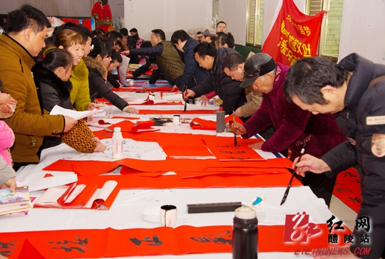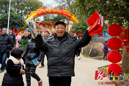大红的灯笼高高挂起,热闹的龙灯欢腾舞起,农历腊月26的司徒村综合文化站处处张灯结彩。在醴陵本土民歌《思情鬼歌》的欢快曲调里,村民们津津有味地观看着由株洲和醴陵两地艺术家们联合献上的精彩文艺表演;10位书法家现场挥毫泼墨书写的春联,更是成为村民们争相收藏的传统“年货”;原本带着爷爷奶奶一起来看大戏的唐美蓉,和许多村民一样,意外地收获了一张由摄影家现场拍摄的全家福照;而更多的村民则被免费赠送的1300余册农业、科技、致富、少儿类书籍吸引,纷纷上前领取;孩子们则围在灯谜前你一言我一语的猜谜领奖。