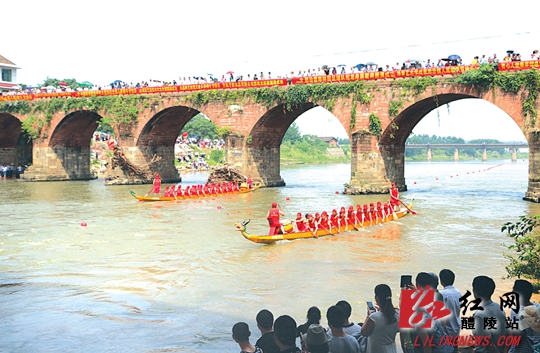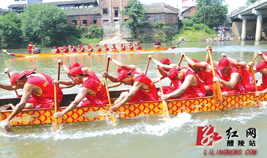 在渌江石亭段,随着震耳的鼓点声,选手一齐用力划桨,龙舟飞速前进。端午节当天,石亭镇的16支队伍精神抖擞,比赛现场吸引了近千人前来观看,拉拉队的加油助威声一浪高过一浪。队员整齐划一的动作,激情洋溢的呐喊,让围观群众都禁不住拿出手机拍照留念,传递出浓浓的端午情。