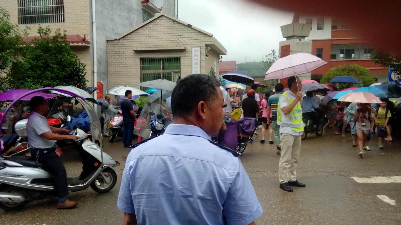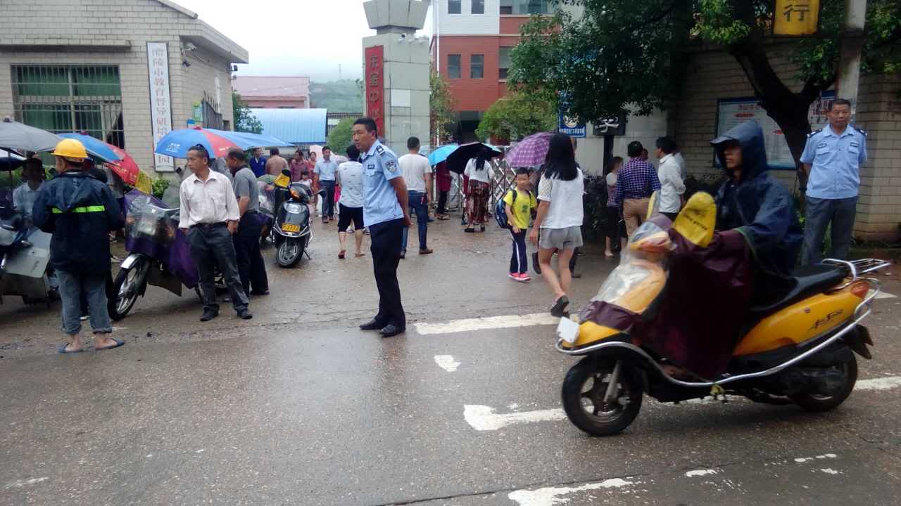 6月14日下午16时 ,正值东堡中心小学放学时段,该镇突降阵雨,道路湿滑,极易发生交通事故,为保障学生平安放学回家,新东堡村社会事务管理工作队冒雨,在学校周边路段指挥疏导接送学生车辆有序离开,以保证道路畅通。