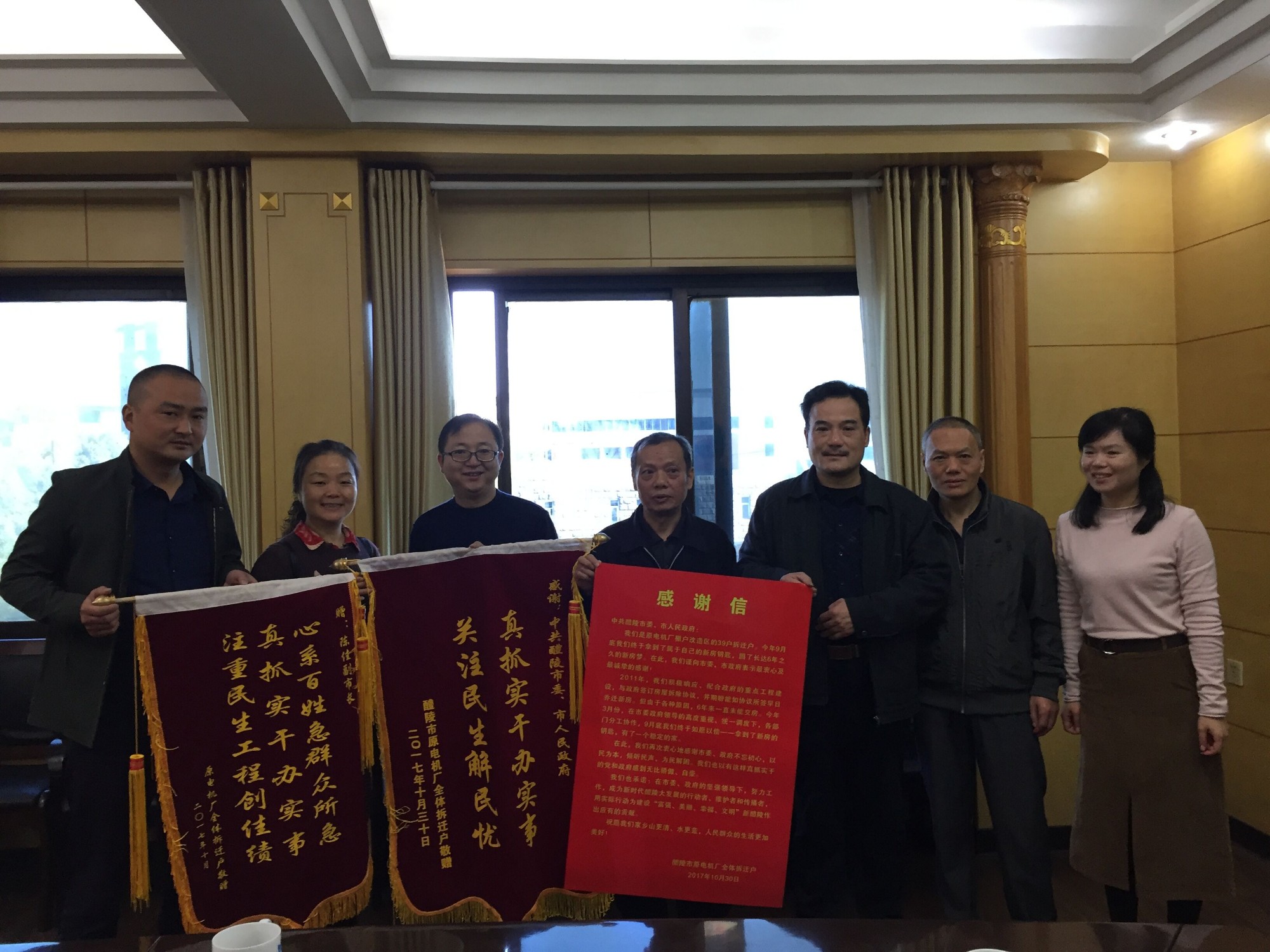 10月31日仙岳山街道碧山社区原电机厂39户拆迁户代表向市委、市政府送来锦旗,感谢在市委、市政府的高度重视下,多个职能部门譬如仙岳山街道办事处、碧山社区和建宸置业有限公司等单位齐抓共管,多方面努力下圆了39户拆迁户6年的新房梦。2011年39户居民为了配合政府重点工程项目建设,与政府签订房屋拆迁协议,在安置重建过程中,由于各种原因,6年来一直未办理入住手续,今年3月份以来,由市级领导陈佳副市长牵头,相关部门配合协调,终于在9月底兑现承诺,如期交房。拆迁户代表李华虎激动地说:“千言万语汇成一句话,感谢、感恩党和人民政府。”