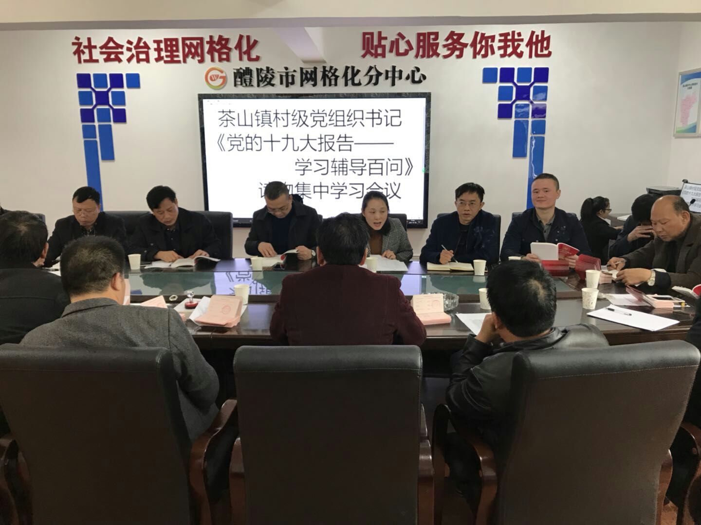 党的十九大召开以来,茶山镇以“看直播、听党课、写心得”多种方式在镇村两级掀起了学习贯彻党的十九大热潮。11月16日,党的十九大读物一到,茶山镇立即组织18位村级党组织书记集中学习党的十九大学习辅导读物——《党的十九大报告学习辅导百问》。