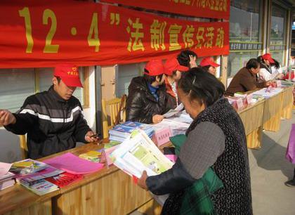 该镇联合教育、公安、交警等部门,利用农村赶集时间,深入到全镇赶集比较集中、人流量大的大坝、潭塘、桃花等村进行法制宣传。主要根据农民法律需求的新情况、新特点,将法律简易读本和宣传资料发放给农民,加大对返乡农民工、企业破产职工劳动报酬、最低生活保障、劳动合同关系等领域的法律宣传和援助力度,对群众的咨询,做到一一解答并耐心的化解他们的疑问。活动共发放各种法律资料和传单200多份,发放《公民安全防范手册》8000余册。并现场接受法律咨询,征求人民群众对政法系统的意见和建议,为更好地开展工作打下坚实的群众基础。