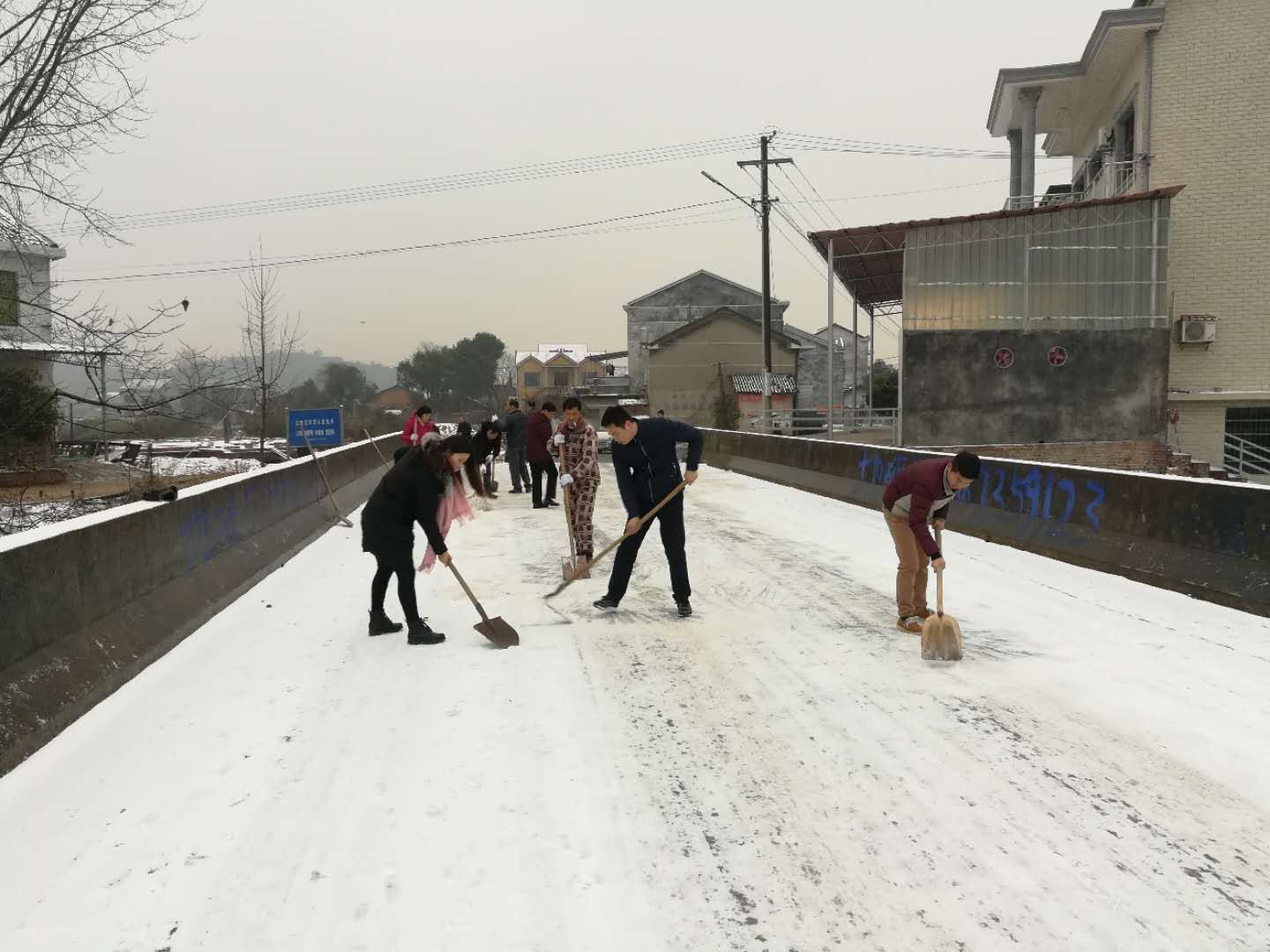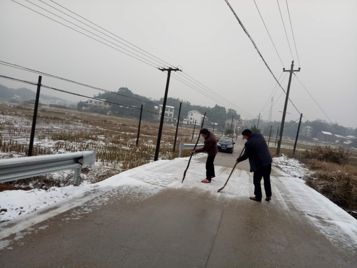 党员干部们出现在辖区内结冰最厚的路段,融化着每个路段上的坚冰。早早来到德星桥的星桥村总支书记欧阳少忠边扫边对大伙说:"大雪天路不好走,我们得赶早出来扫扫,居民出门就能方便安全些。"大家分工明确,拿着扫帚、铁锹,对辖区的主要交通道路、坡度较大的地段及不易融化的阴暗地段进行地毯式清扫和铲雪。在他们的带动下,越来越多的群众也加入到清雪的队伍中来。在大家的共同努力下,坚硬的冰层被一一破开,一条又一条可供居民和车辆安全通过"安全线"被开辟出来,过往的村民纷纷致以感谢。