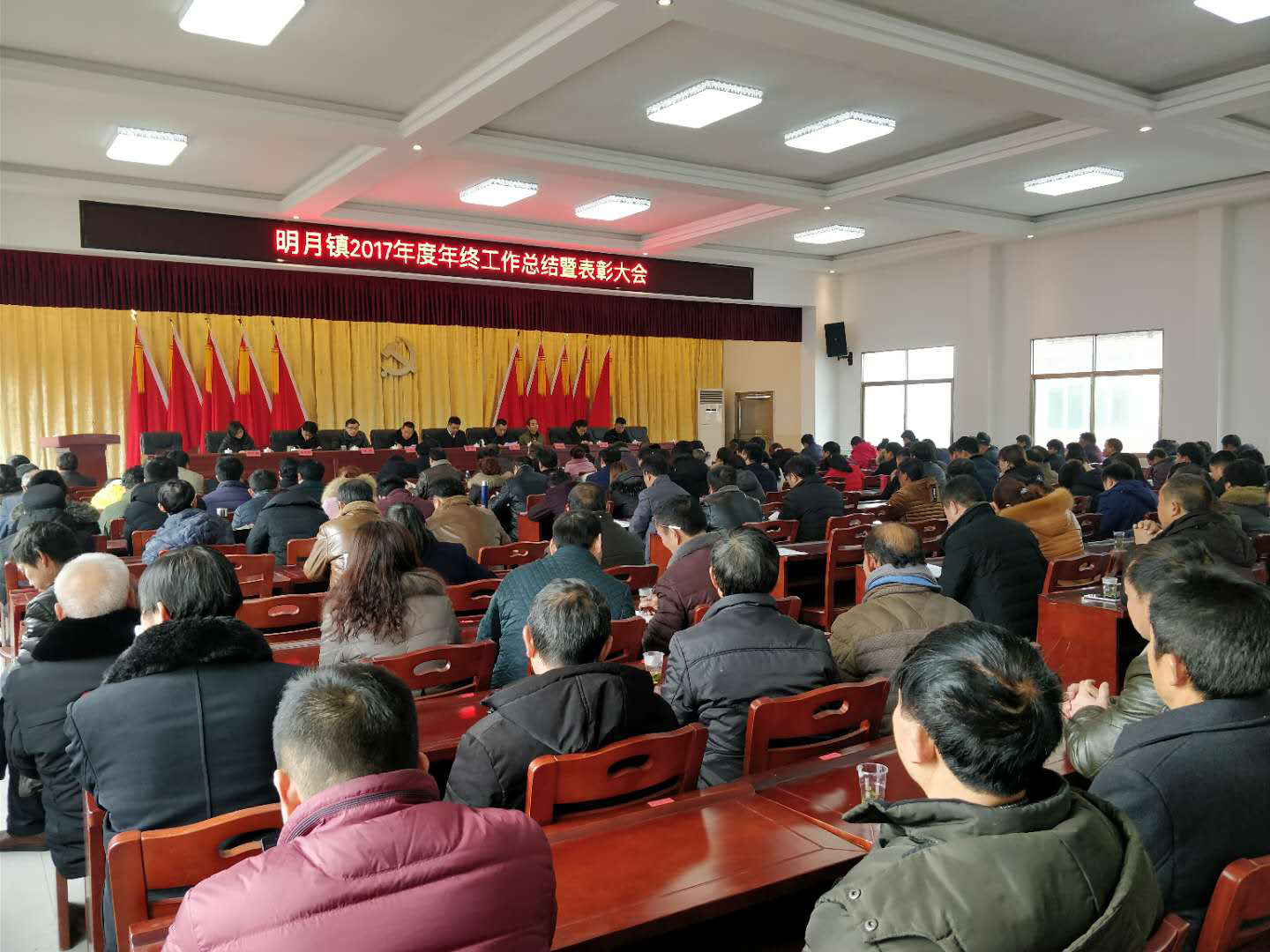 2月1日上午9:30,明月镇在机关二楼会议室召开全镇2017年度总结表彰大会。出席大会的有全体机关干部、各村(居)两委干部、村级党建专干、部分村民小组组长代表、驻镇单位负责人、部分企业代表等221人。