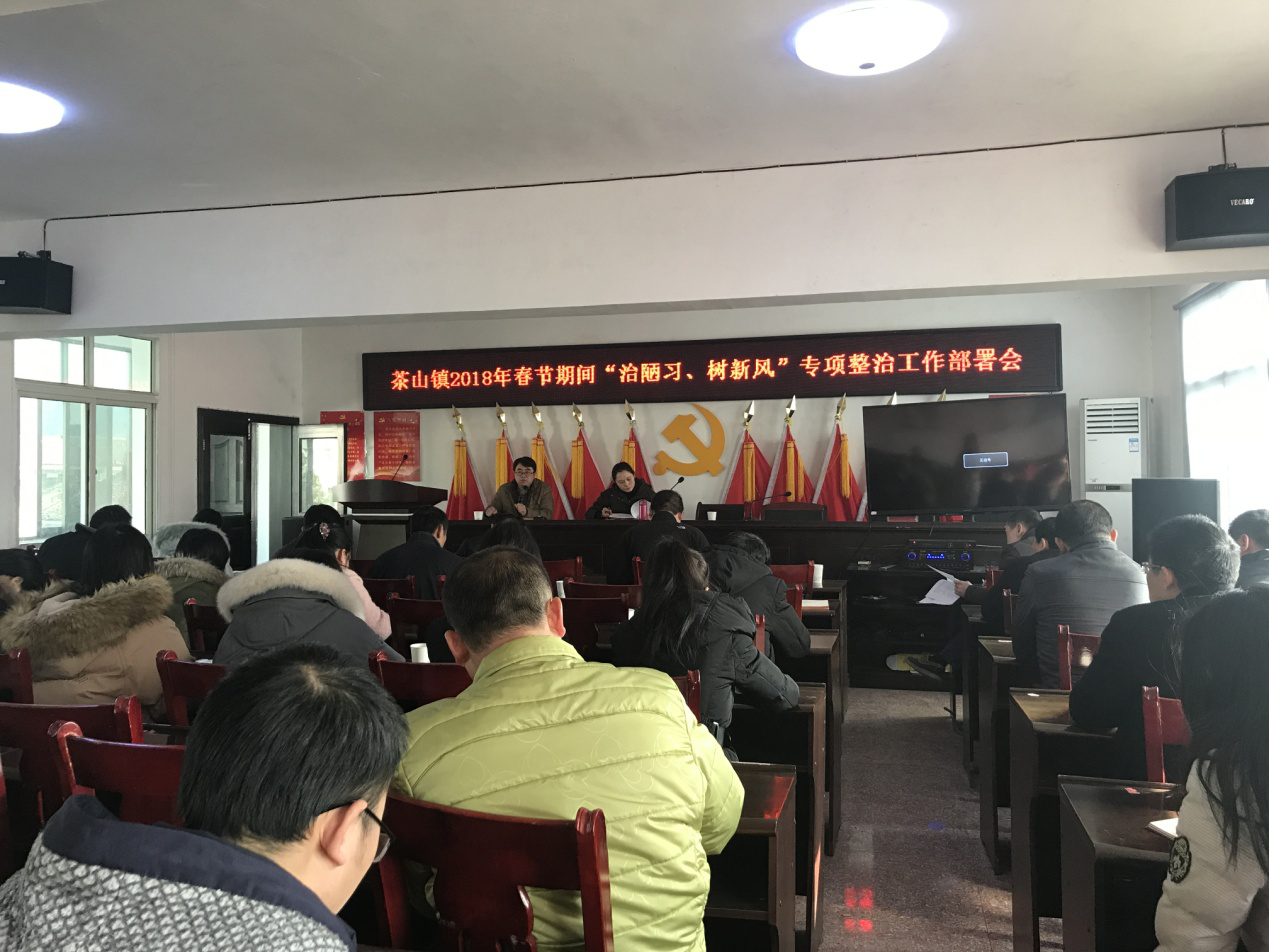 2月6日下午,茶山镇召开了2018年春节期间“治陋习、树新风”专项整治工作部署会,镇班子成员及全体机关干部参加了此次会议。镇纪委书记李成就开展春节期间“治陋习、树新风”专项整治工作进行了部署,重点在违规收送礼品礼金、违规饮酒赌博、违规使用公车、超标准接待、违规操办婚丧喜庆事宜等几方面开展整治行动;同时,要求机关干部在春节期间严格遵守工作纪律和作风纪律。