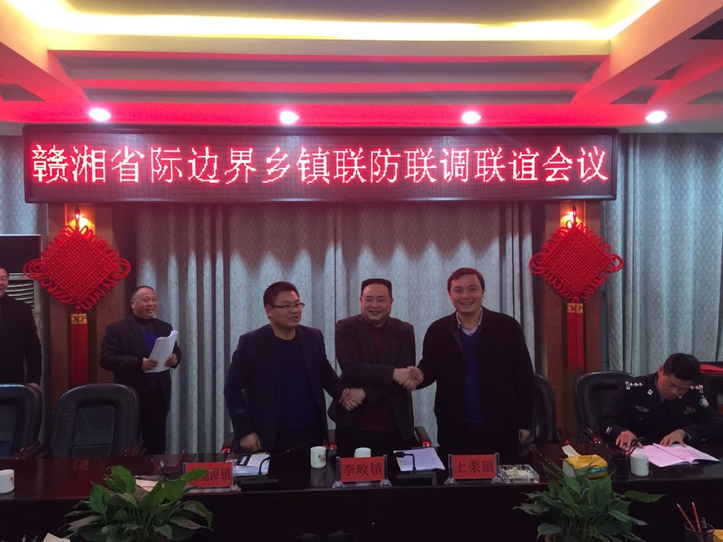 2月7日,在李畋镇党委书记杨翔同志的倡导下,在江西上栗镇党委和白兔潭党委的共同推动下,湘赣省际边界乡镇联防联调联谊会议在江西省上栗镇胜利召开,此次会议主要就湘赣边界涉及安全、民生、司法、警务等多方面的工作进行了沟通,达成合作意向,并签署相关合作章程。