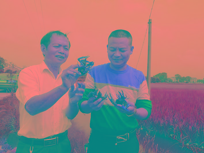 在田垄边站稳后,吴发人叫上股东易云祥,合力收起38米长的地笼,活蹦乱跳的小龙虾让人眼前一亮。“现在气温低于25℃,小龙虾开始往泥里钻,准备冬眠产卵,你要早一阵子来,网兜里密密麻麻,要好几个人才能扯出来。”吴发人说,前阵子基地每天能收两三百斤龙虾,求购电话响个不停。