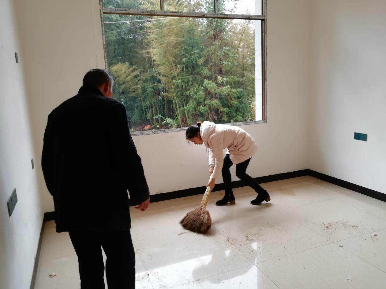 (与贫困户一起打扫卫生)