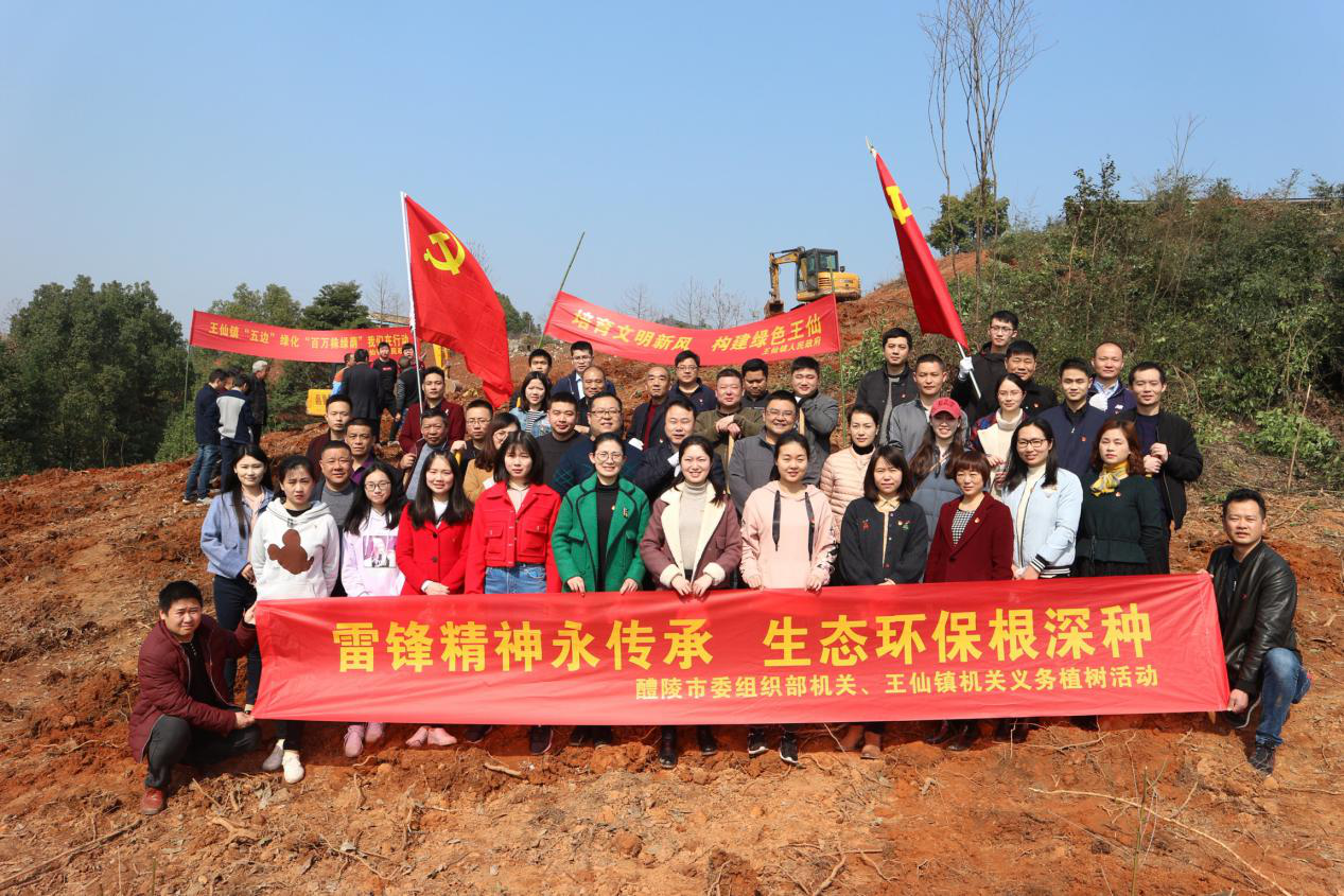 3月12日,王仙镇三狮村党旗飘扬,一派热火朝天的劳动景象。醴陵市委组织部及王仙镇机关共计60多名党员干部来到三狮村,进行“学雷锋”义务植树活动,以实际行动迎接第41个植树节。
