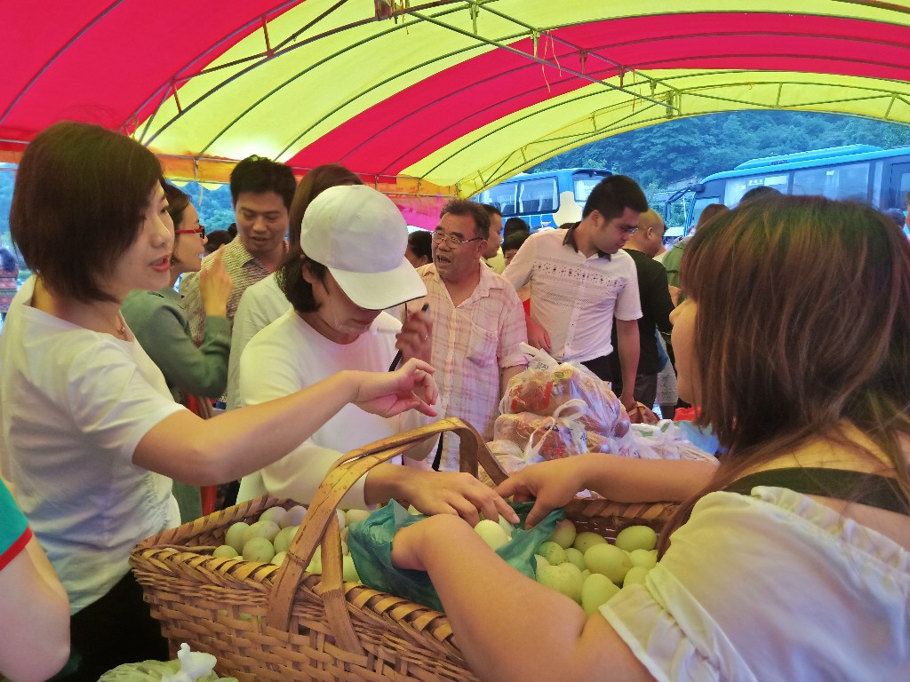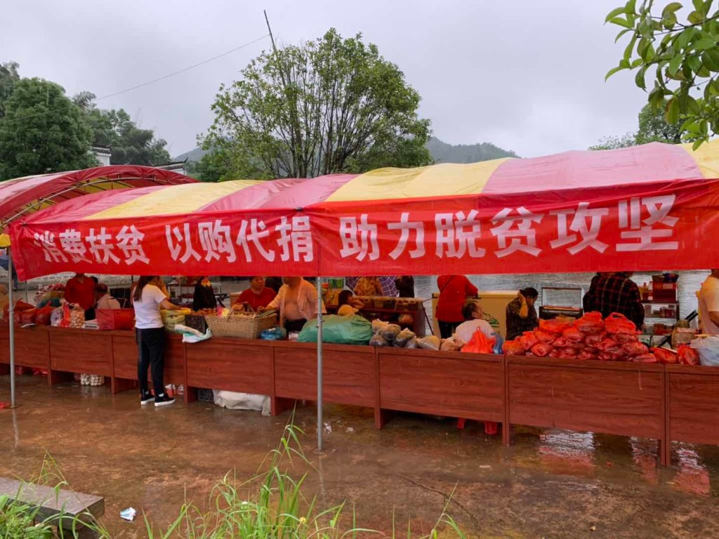 “这咸鸭蛋怎么卖呀?”“都是自家养的鸭生的,自己亲自腌的,好吃的咧……”贫困户黄购兵积极地推销着。5月19日下午,尽管天空不作美,淅淅沥沥地下着雨,但游客们还是熙熙攘攘地集聚在隆兴坳村的耿传公祠前坪,红薯粉、竹笋、盐果子、咸鸭蛋、藕尖、黄鳝等农产品琳琅满目。
