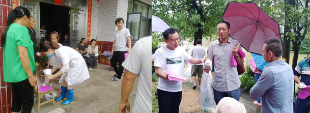 7月9日,在市卫健局和孙家湾镇党委政府的统筹安排下,孙家湾镇卫计办、卫生院、村卫计专干、村医、组级信息员三级联动开始进行灾后医疗救治防疫消毒工作。镇卫计办干部负责与村级对接退水后的受灾点、需消毒户数、受灾安置点,镇卫生院负责向上级领取筹备药品,分配医务人员与卫计办干部一起下村对受灾安置点、已退水道路两旁、农户家、水井等区域进行消毒,发放灾后防病知识要点宣传页和84消毒液,集中讲解消毒药品使用方法。村组干部、村医分组下户送消毒液,安抚受灾群众、帮助群众清扫卫生。层层发动,同步做好卫生防疫,给受灾群众营造健康住所。
