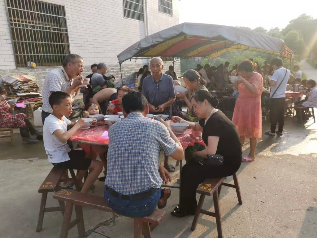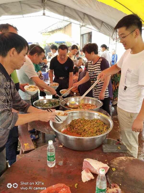 在受灾最为严重的西岸村,并没有出现沉重压抑的气氛,反而是一片轻松和谐,村部设立的临时食堂里村民正有条不紊的忙碌着,你们来洗菜,我们来煮饭,他们来切菜.....村干部们也加入其中掌勺布菜,邻里之间、老少同堂,大家一起排队打饭围圆桌吃起了暖心“团圆饭”。