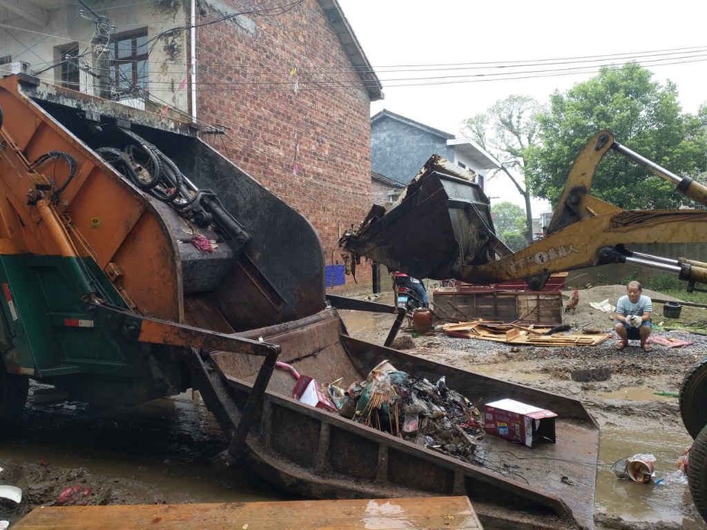 洪水过后,全镇许多地方一片狼籍,曾经环境优美的村居到处都是淤泥,垃圾遍地。为了尽快还群众一个干净卫生家园,垃圾清运刻不容缓。在镇党委政府组织下,部分机关干部机关干部、村干部、石亭中学老师、公益组织志愿者等上百人在受灾严重的村开展了垃圾分类清运行动。