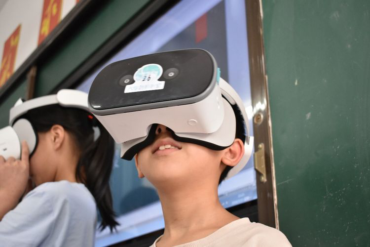 二、科技启迪,放飞科学梦想。VR体验课开启梦幻之旅,VR课是利用电脑模拟世界,提供使用者关于视觉、听觉、触觉等感官的摸拟,让使用者如同身临其境一般,可以及时、没有限制的观察三度空间内的事物。将精确的3D世界影像传回,产生临场感,孩子们第一次接触到,既兴奋又紧张,更充满期待,实境体验到了全球变暖带来的后果,他们都非常感兴趣,也体会到了保护环境的重要性。