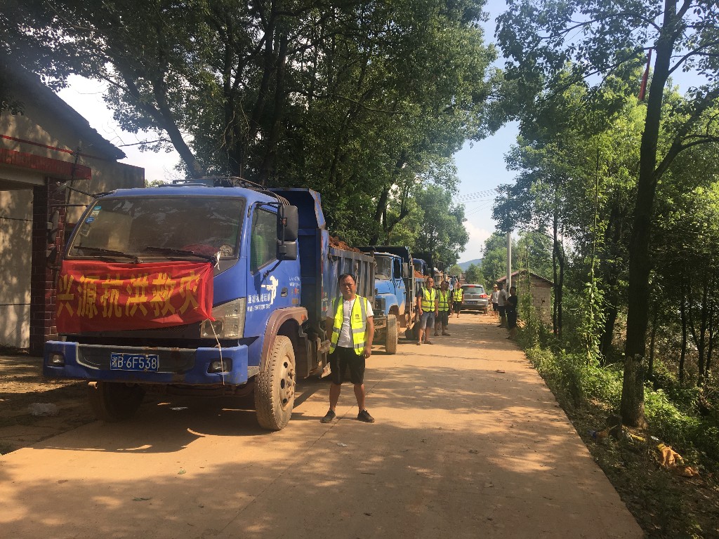 下午19点10分,一排车头悬挂着“众兴源抗洪救灾车队”横幅的25辆运输车,整整齐齐地排列在了石塘岭抢险工程现场。一到现场,车队马上进入到了施工状态,反光背心、安全帽在夕阳的余辉中闪烁不停,现场秩序井然。挖方、装卸、运输、安全指挥有板有眼,人、车、机迅速完成最佳配合,与坚守施工的白兔潭、嘉树、均楚、高新集团等车队并肩战斗,一直奋战到凌晨2点。