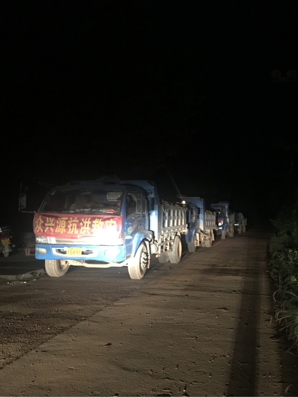 现在已是深夜十一点,施工仍然在紧张有序地进行,抢险铁军形成车流在漫天尘土中穿行,形成抗洪救灾一线一道特别的风景。